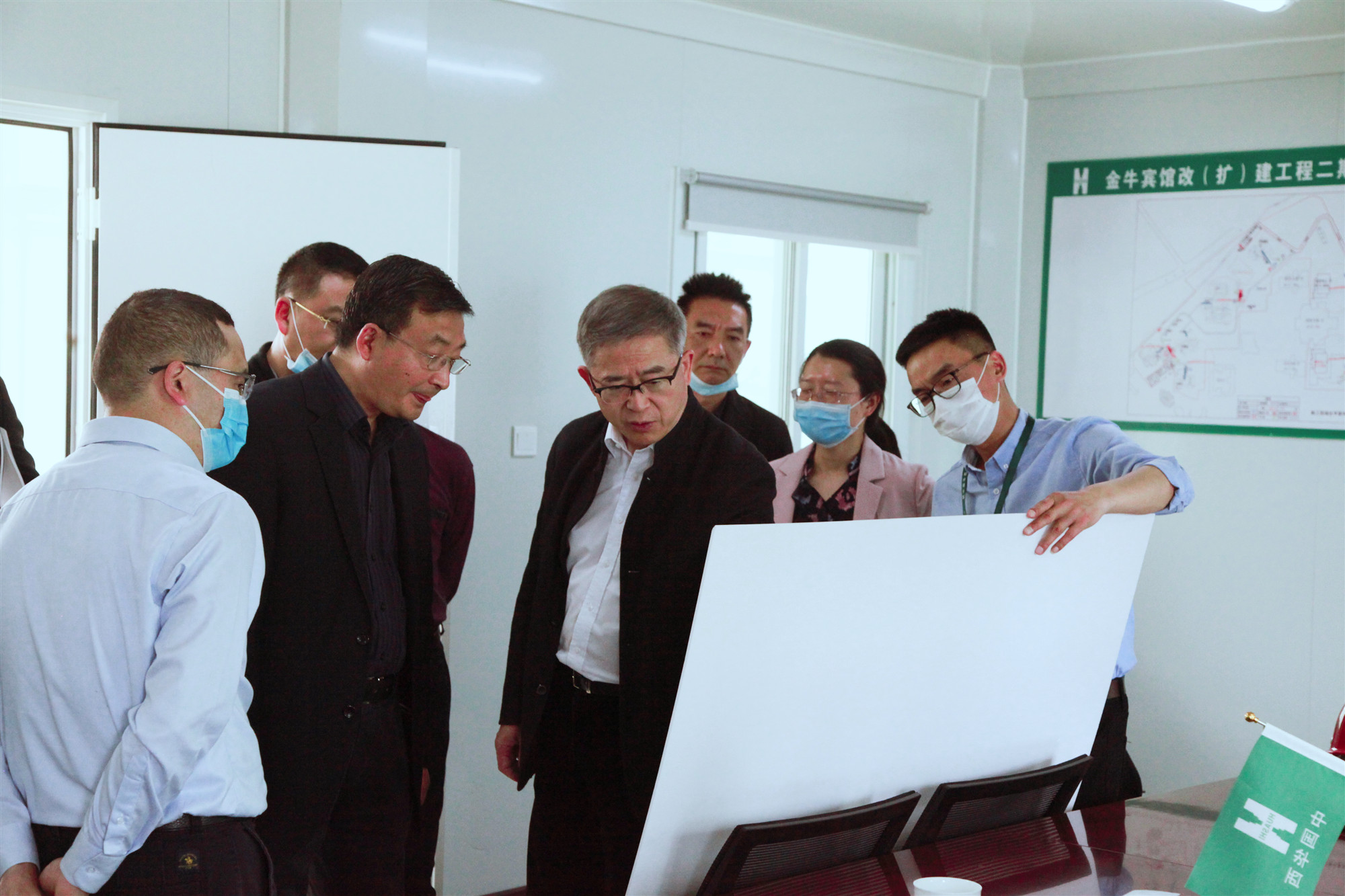 杨斌查看了施工现场总平效果图和会议中心、政务楼新增门厅施工进展情况,详细了解了各参建单位的施工进度、质量安全、疫情防控、材料比选、图纸优化以及园林设计等工作推进情况。