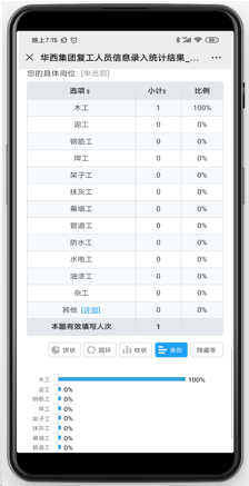通过“复工人员信息统计平台”,无论是管理人员还是劳务作业工人,通过手机扫描二维码,只需不到2分钟的时间里就可以完成个人健康信息和疫情期间行动轨迹信息填报,各级管理人员通过相应权限可在1分钟内完成一线基层防疫信息归集。信息归集后,平台可以快速实现针对具体人员的所属机构、健康情况、疫情期间行动轨迹、交通工具同乘情况等防疫信息的跟踪查询。该平台在复工疫情防控工作中的应用价值主要体现在7个方面,一是贯彻落实了各级政府对防疫工作的具体要求;二是平台程序操作简单便捷,容易上手,对比传统表格填报有极大优势;三是可以有效减少集中、当面采集信息,降低纸笔等资料填报、传递过程中交叉感染风险;四是可以降低防疫信息跨层级上报、汇总、核实等流程造成人力、物力消耗;五是可以提高一线基层疫情数据信息采集及归集效率,避免数据失真和数据时效不强而延误疫情防控有利时机等问题;六是可以帮助各级单位全覆盖、无死角地进行疫情排查;七是可以利用数字化手段加强防疫教育。