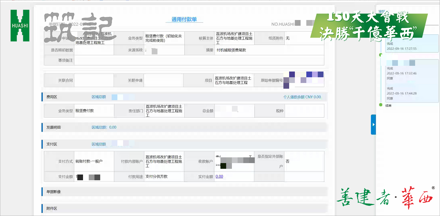 为满足业务和数据互联互通需求,疏通难点、堵点,华西数字化团队组织相关方连续3天沟通讨论,奋战到凌晨,最终在9月16日,依托四川场道荔波机场项目,圆满贯通了从项目管理系统到财务共享系统的第一单支付。同时,供应链系统(善建云采3.0)也成功完成与财务共享系统合同结算接口的联调工作,标志着“善建云平台1.0”成功实现了“业财一体化”建设目标。