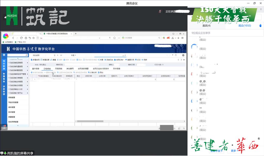 9月疫情突然来袭,华西数字化团队充分发挥数字化技术手段,转战线上,通过线上方式组织召开二十余次会议,迅速处理用户反馈的几十项需求和问题。特别是在9月7日,为提高合同信息录入效率、减少重复问题出现的几率,华西数字化团队面向集团下属14家施工单位超1000人,组织召开“项目管理系统收、支合同详细字段讲解及尚存问题合同整改指导线上专题讲解会”,邀请业务专家对项目管理系统各类合同、字段逐一进行详细的讲解。
