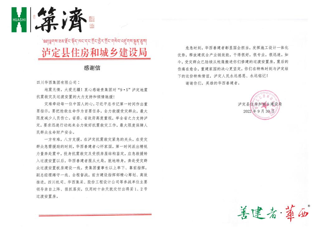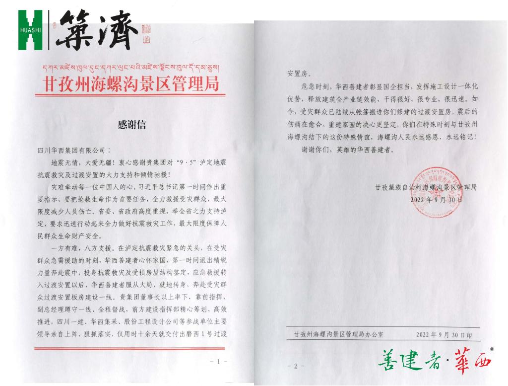 近日,集团收到两封信,文字浅浅,情意浓浓……述说着有关华西善建者与泸定“9·5”地震受灾群众,在特殊时刻结下的一段“鱼水情”,寄信人落款分别是“泸定县住建局”和“海螺沟景区管理局”。