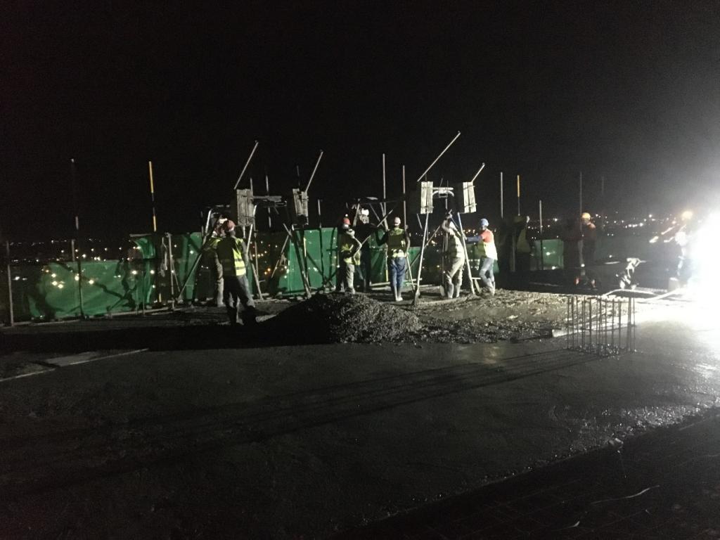 东部医院项目地处肯尼亚内罗毕SOUTH C住宅区,因肯尼亚政府部门不允许在工作外时间生产,周边邻居对休息时间也非常看重,在建项目偶尔加班都可能面临被邻居投诉。自东非公司给项目下达了“11月中旬完成项目封顶”的目标后,项目部积极与当地政府沟通,争取到邻居理解和同意,即刻开启了“白加黑”战斗模式,连夜进行混凝浇筑施工。内罗毕夜晚的大风刮得呼呼响,吹得人脑瓜子疼,周边逐渐沉寂下来,项目部却是热火朝天、一派繁忙景象,“今晚加鸡腿,大家加油干,咱们争取在本周打完这层板!下月中旬务必保证项目封顶!”项目经理陈光俊站在正在浇灌混凝土的楼顶上鼓舞着士气。虽然是在加班抢工期进度,但项目部坚持质量与效率同步,从配料到混凝土拌制、运输、浇筑、振捣、收光,项目管理人员盯紧每一个环节,确保施工质量和整体施工节奏。