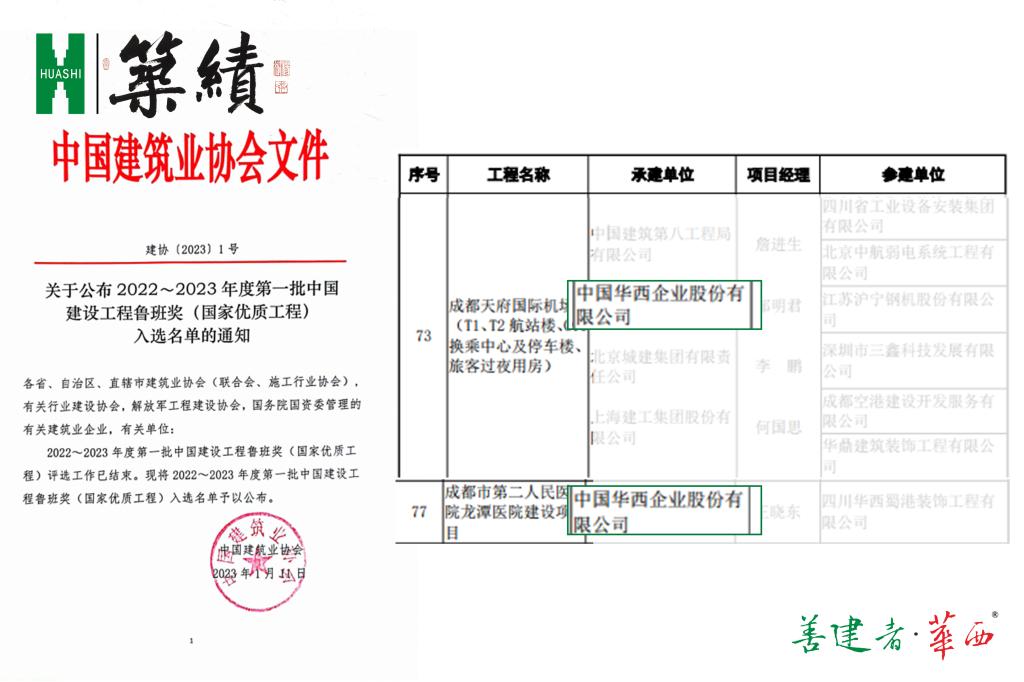 继“千亿华西”提前一年实现的捷报传出后,华西集团再度收获新年喜讯。在最新的国家级系列奖项公布的名单中,华西集团赫然登榜,分别捧回2座鲁班奖,1座国家优质工程金奖,以及3项国家优质工程奖项。