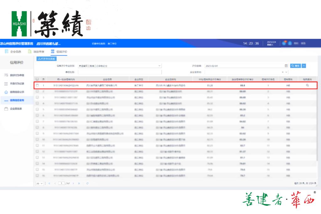 2023年开年,华西九公司在凉山州信用评价体系1324家房建施工总承包企业中排名跃居第一,首次荣膺榜首。
