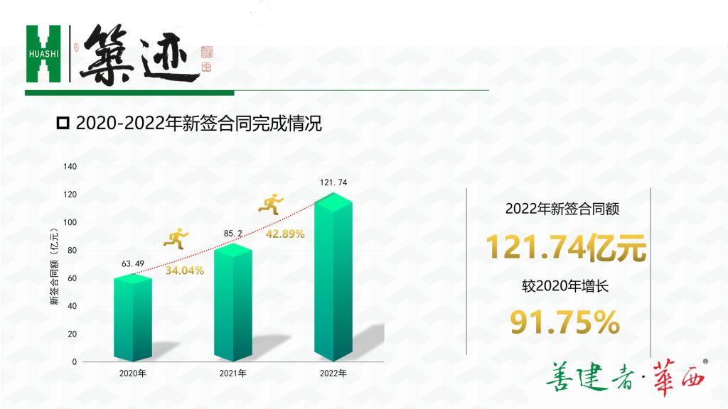 四川四建勇当集团在德阳实施经营战略的执行者,持续拓展市场空间,经营规模承压而上。2021年,完成新签合同85.2亿元,同比增长34.19%;2022年完成新签合同121.74亿元,同比增长42.89%,该项指标连续超额完成集团下达的任务,并屡创自身历史新高。