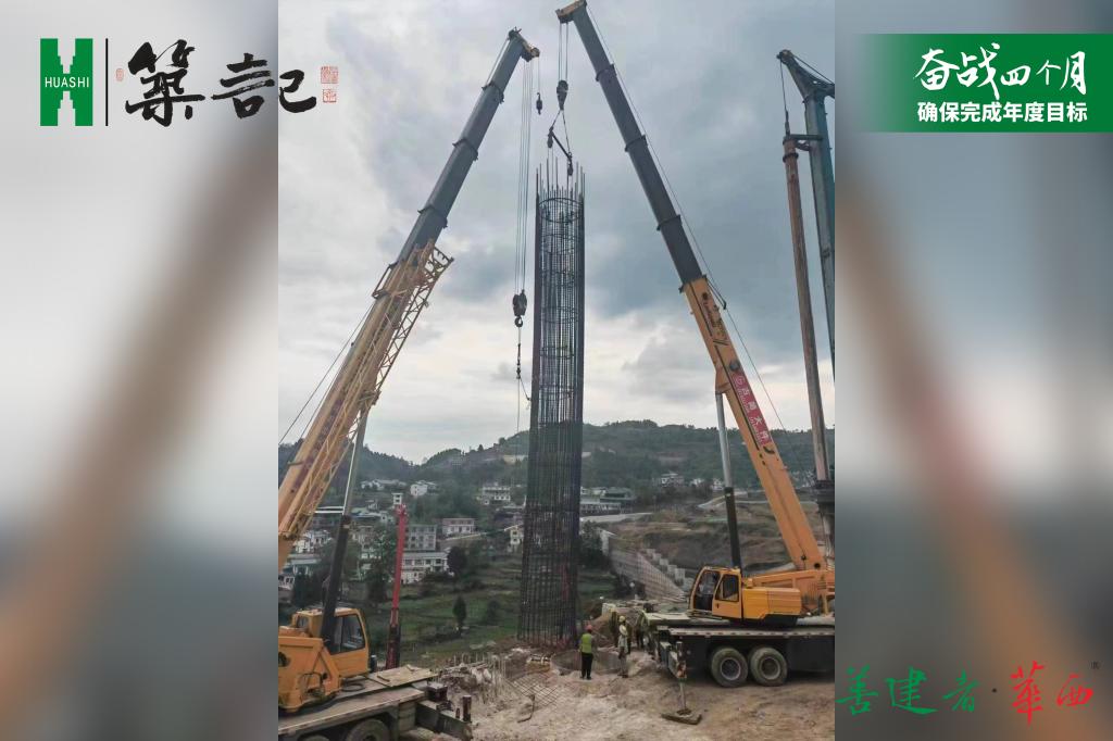 场平工程的一大施工难点在于陶坛库区旁的高架桥区域,桥梁全长181.51米,桥墩最高处15米,与库区同步施工,又因场地狭窄,地势高差大,前期需要的400吨钢筋,30万米钢管,无法经由机械设备一次送达。为克服场地影响,项目组织了120人的人力运输队,与三台起吊设备协同作业,在三级作业平台上完成接力转运。先由吊装设备将材料吊运至二级工作平台,再经人工将材料运至三级工作平台,最终交由施工环节,确保桥梁施工进度。
