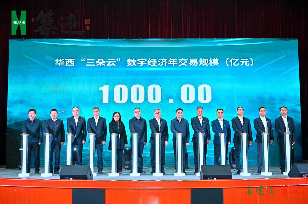 华西“三朵云”数字经济年交易规模正式突破千亿大关,华西有喜,各方来贺!12月12日,省国资委党委委员、副主任王先权,省住建厅党组成员、副厅长程刚,集团党委书记、董事长杨斌等领导,共同见证华西数字产业这一历史性时刻,华西正式步入营业收入超千亿、数字经济年交易规模超千亿的“双千亿”时代。