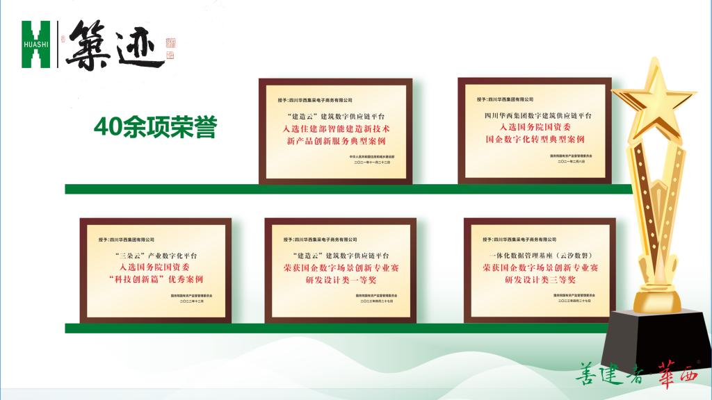 ▲华西作为建筑行业唯一代表,入选“国务院国资委国企数字化转型典型案例”“国务院国资委科技创新优秀案例”,取得“住建部智能建造新技术新产品创新服务典型案例”等40余项荣誉。参加国务院国资委国企数字场景创新专业大赛,荣获一个一等奖和一个三等奖,是获奖单位中唯一的四川省属企业,唯一的建筑企业,唯一同时斩获两项大奖的企业