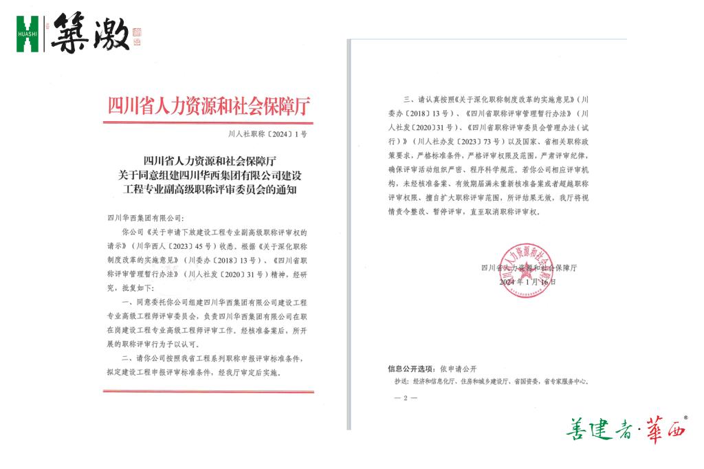 为获得建设工程专业高级工程师自主评审授权,2023年4月以来,集团人力资源中心积极研究省上有关高级职称授权的相关政策,精心起草《十大网投正规信誉官网组建建设工程专业高评委论证分析报告》,主动对接省国资委、省住建厅等上级主管部门,分别获得两个部门的书面同意意见,历时近一年,终获省人社厅的书面批复。这是自四川省持续深化高级职称评审权下放改革以来,华西集团成为全省首家获省人社厅以委托评审方式授予建设工程专业副高级职称评审权的企业。