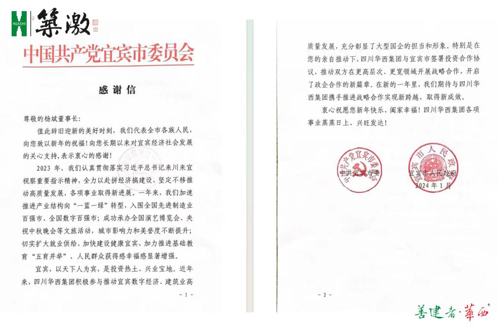 “四川华西集团与宜宾市签署投资合作协议,推动双方在更高层次、更宽领域开展战略合作,开启了政企合作的新篇章。”一封感谢信,饱含着华西集团与宜宾市深厚的企地情谊,记录着2023年双方合作成果,更预示着未来无限的合作空间。