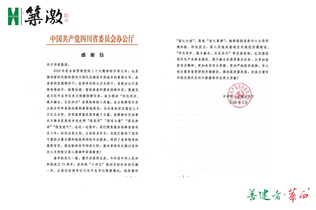四川省委办公厅在信中提到,2023年,你们(华西集团)聚焦服务保障省委有关工作,站位全省大局,主动担当作为,为我们(四川省委办公厅)提供了坚实可靠的力量支撑和高效周到的专业服务,得到了省委领导的高度肯定。