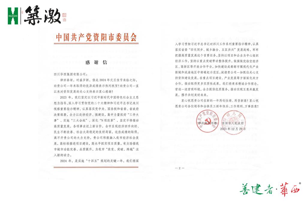 资阳市委市政府的来信中提到,2023年全市各项发展成绩的取得,离不开贵公司的大力支持,贵公司积极融入我市经济社会发展,高标准推进项目建设,高水平抓实项目质量,有力助推我市城市功能完善、品质提升,为我市“改变、突破、跨越”注入新的动力。
