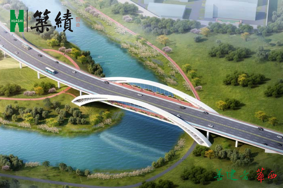 项目位于自贡高新区卧龙湖产业园,建设内容包括起、终点交叉口改造,道路工程、桥梁工程,并建设相关配套市政排水、交安、照明、接驳骑游道、景观绿化等基础设施。其中,桥梁采用中承式无风撑钢箱拱肋结构,主拱横跨釜溪河,全长223.5米,桥宽41.2米。