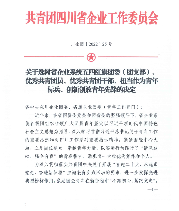 在中国共青团成立100周年之际,捷报传来!省企业团工委印发了《关于选树省企业系统五四红旗团委(团支部)、优秀共青团员、优秀共青团干部、担当作为青年标兵、创新创效青年先锋的决定》,其中华西集体2个集体3名个人榜上有名,他们在项目一线默默奉献,在战疫前线挥洒汗水,在科研建设创新动能,用实际行动践行了“请党放心,强国有我”的青春誓言。