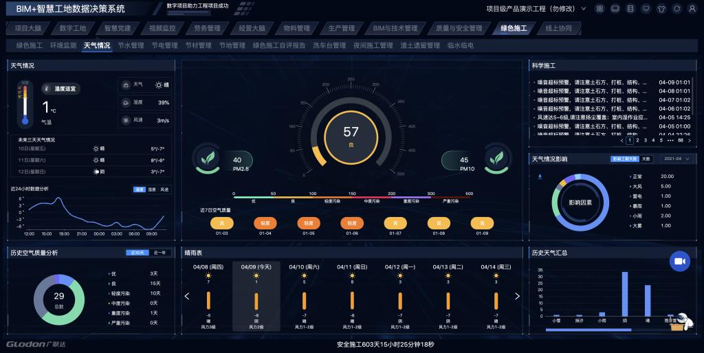 通过“BIM+智慧工地”平台查看塔吊运行数据并优化施工安排,项目部塔吊日均工效从6月的6.3小时,提升至7月的7.2小时。实时查看噪音、扬尘监测、自动喷淋等各类数据并及时优化调整施工组织,项目部达到贵州省绿色施工项目评选加分标准……