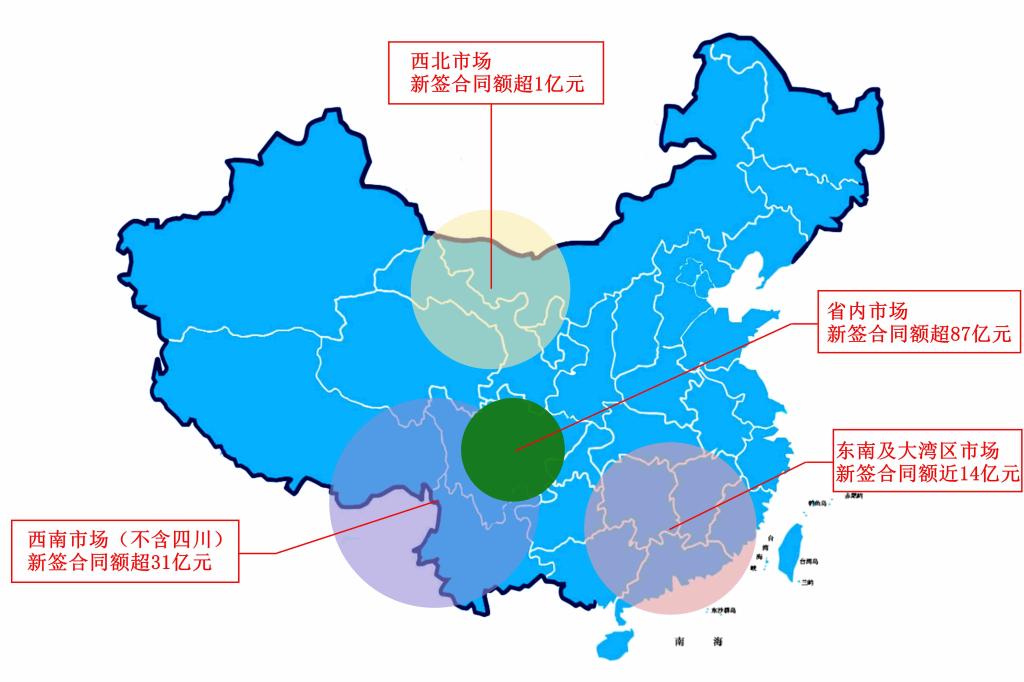2022年四川机司在国内外各地承揽多项重点工程,省内市场新签合同额超87亿元,西南市场(不含四川)新签合同额超31亿元,西北市场新签合同额超1亿元,东南及大湾区市场新签合同额近14亿元,各区域市场全面开花、硕果累累,新签合同额较去年同比增幅明显,机司“1+2+3”核心区域市场战略布局雏形初现。