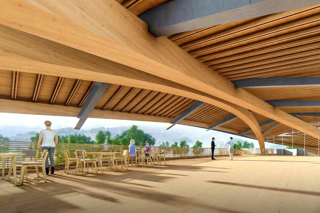 为最大程度展现自然之美,该项目选用新型生态环保材料进行建设,如竹编栏杆、竹编扶手、竹编木饰面吊顶等,在保证使用功能的基础上,又保证了材料的环保和再生利用。