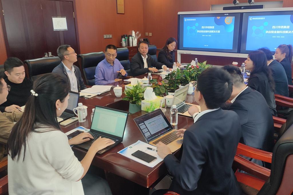 会上,丁云波介绍了华西数产有关情况。川金数科介绍了公司自研供应链金融平台——川金链相关情况,对商票业务、普惠金融、电子债权多级流转等系统进行了操作演示。与会人员就供应链金融平台的技术搭建、金融产品设计以及运行管理方案等进行了深入交流。