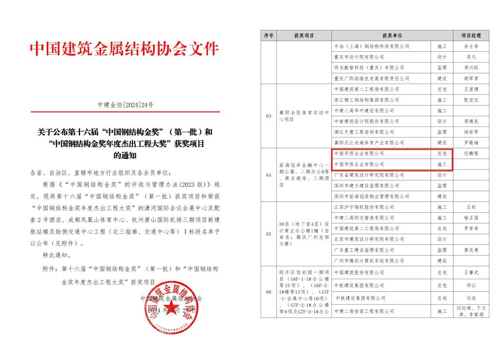 近日,中国建筑金属结构协会公布了第十六届第一批“中国钢结构金奖”获奖项目名单。由深圳中华西承建的前海冠泽金融中心一期公寓、二期办公B塔、商业裙房、三期酒店项目成功斩获中国建筑钢结构行业工程质量的最高荣誉奖——中国钢结构金奖。