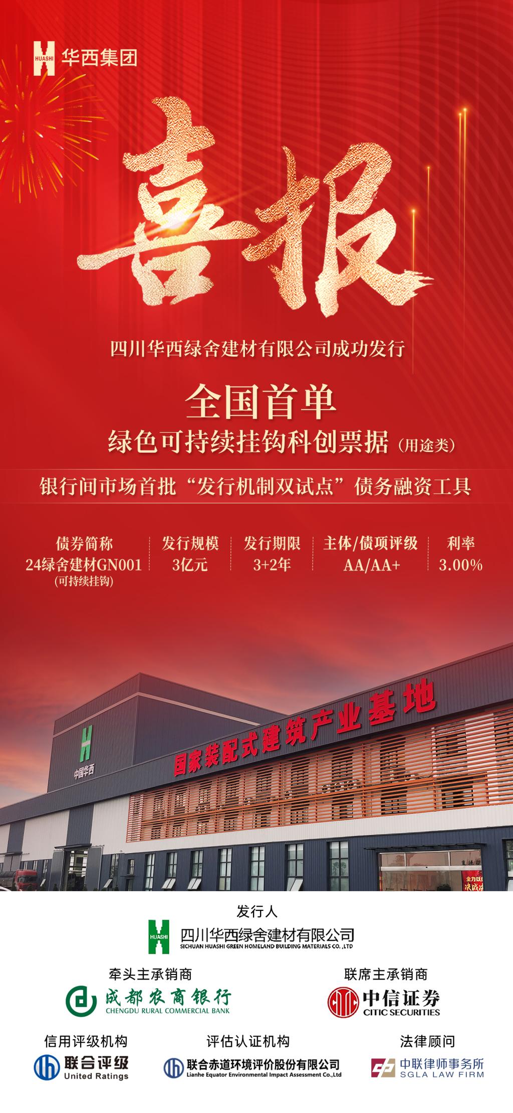 7月23日,华西绿舍面向专业投资人非公开成功发行“2024年度第一期绿色定向债务融资工具(可持续挂钩/科创票据)”,发行规模3亿元,期限3+2年,债项评级AA+,票面利率3.0%。本次发行是华西绿舍在银行间市场的首发亮相,该笔债券也是全国首单绿色可持续挂钩科创票据(用途类),同时也是银行间市场首批“发行机制双试点”债务融资工具,募集资金将全部用于绿色建材生产项目。