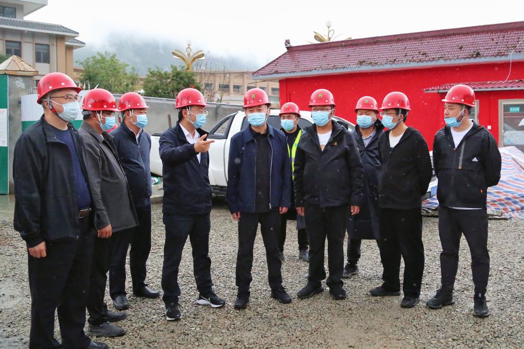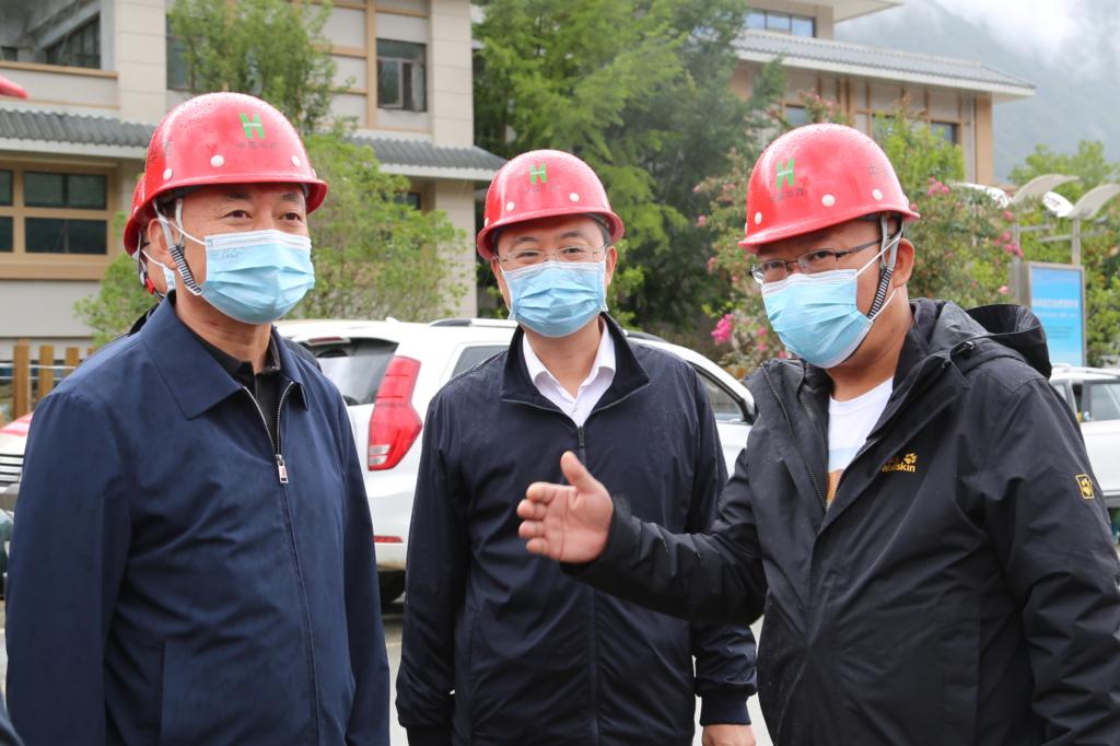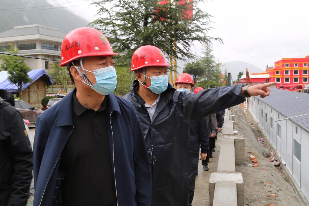 9月22日上午,四川省甘孜藏族自治州委书记沈阳一行冒雨来到磨西镇,调研华西集团建设的泸定震后过渡安置房项目。集团副总经理汪涛作情况汇报。