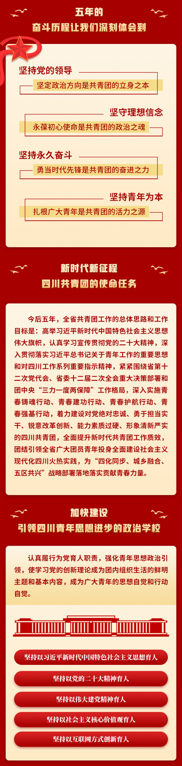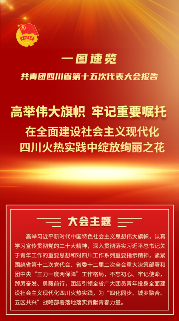 傅振邦代表共青团中央向大会召开表示祝贺。他指出,四川共青团要坚持正确政治方向,持续推动学习宣传贯彻党的二十大精神走深走实;聚焦为党育人主责主业,始终成为引领青年思想进步的政治学校;围绕新时代治蜀兴川战略部署,始终成为组织四川青年永久奋斗的先锋力量;服务广大青年全面发展,始终成为党联系青年最为牢固的桥梁纽带;从严从实推动自我革命,始终成为紧跟党走在时代前列的先进组织,组织动员广大团员青年与全省人民一起团结奋斗,在新时代新征程上谱写更加绚丽的青春华章。
