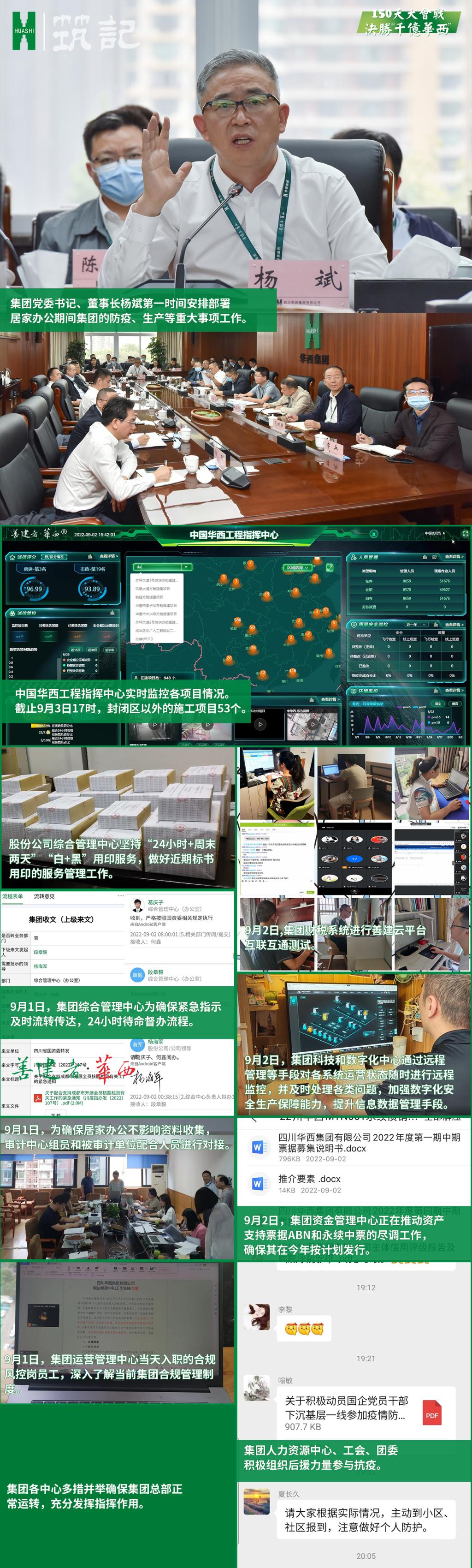 于是,你会看到华西善建者群体里的党员先锋,他们主动请缨,披挂上阵,奔赴防疫一线,消杀、做核酸,保供应,为万家灯火撑起一把伞;你会看到居家办公的善建者,他们依旧在家中的书房、客厅,甚至是在做核酸的人群中,有条不紊地发出调度一线的指令,电话铃声,键盘声只是换了个地方响起;你会看到智慧工地的视窗上,该慢的地方慢下来,该快的地方依旧快马加鞭,走在行业前沿的“数字化”已经让我们实现了管理模式的创新与优化,无形网络串联起了管理后端和生产前端,生产要素调配变得更加从容自如;你会看到市场拓展一线,他们的身影依旧出现在各个重大项目,高端项目的电话会、视频会的现场;你会看到科研团队依旧在屏幕前加紧绘图和模拟实验,技术攻关的时间提前一分,意味着城市的效能提升也就更进一步;你还会看到产业协同的优势正在特殊形势下被放大,兄弟单位出行不便,外区单位主动补位……