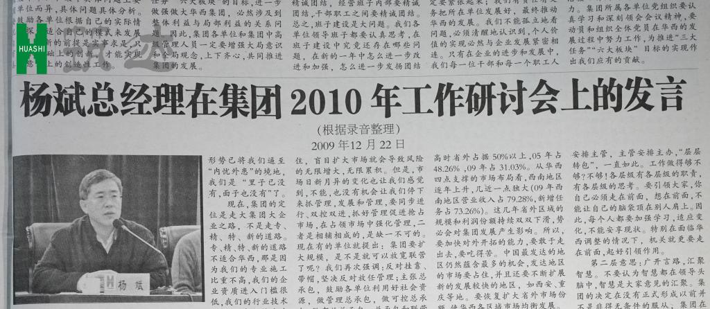 幸运的是,我们找到了2009年12月30日发表在《华西建筑报》上的一篇题为《杨斌总经理在集团2010年工作研讨会上的发言(根据录音整理)》原文,《发言》首次提出了“千亿华西”的构想,让我们时隔13年能找寻这一思想根源。