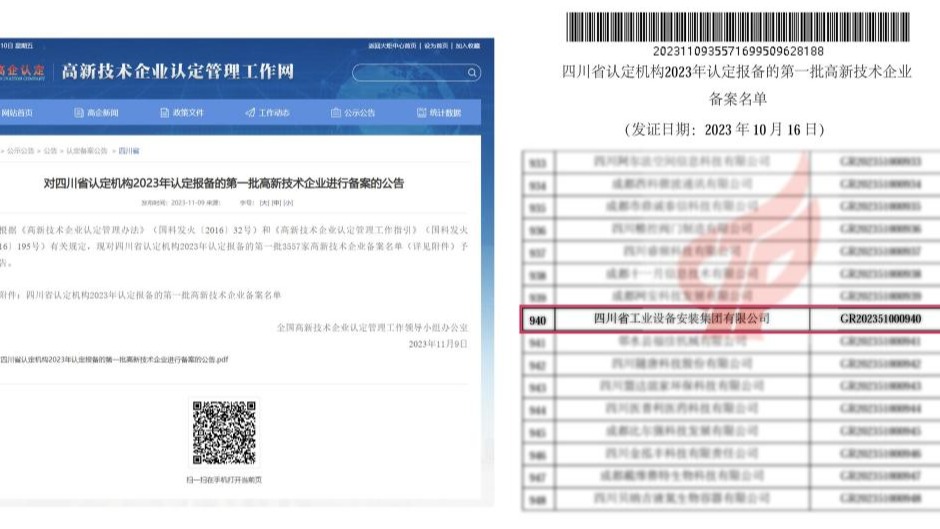 近日,全国高新技术企业认定管理工作领导小组公布四川省2023年认定报备的第一批高新技术企业备案名单,四川省工业设备安装集团有限公司位列其中。这是四川安装继取得“成都市级企业技术中心”后的又一成果——国家级高新技术企业认定。截止目前,四川安装...