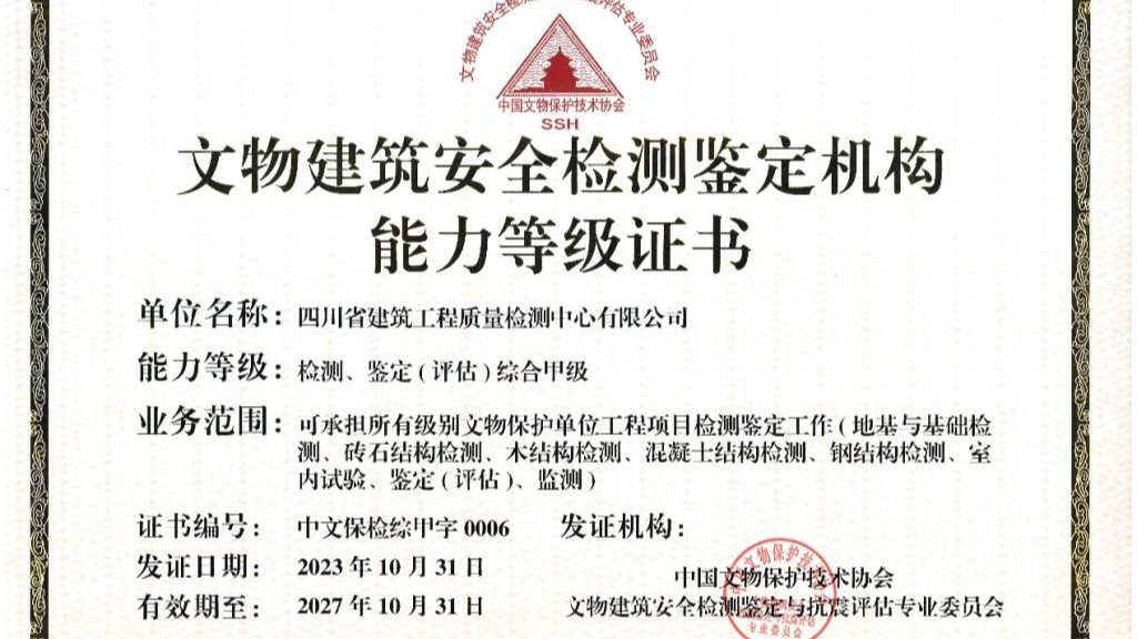 近日,省建科院下属四川省建筑工程质量检测中心有限公司(以下简称为检测中心)顺利通过了由中国文物保护技术协会文物建筑安全检测鉴定与抗震评估专业委员会组织的“文物建筑安全检测(鉴定)机构”能力等级评定和现场考核评审,成为我国西南区域第一家获...