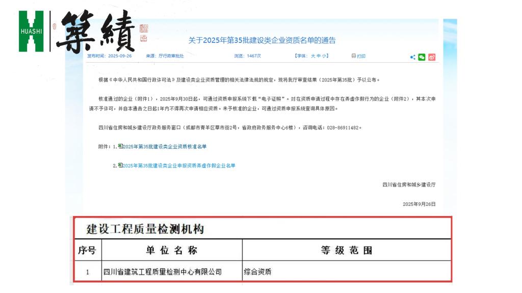 【筑绩】行业最高等级、四川首个“建设工程质量综合检测资质”授予华西