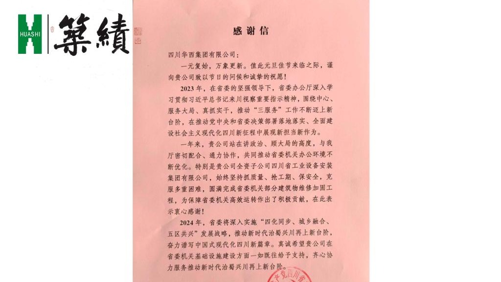 “圆满完成省委机关部分建筑物维修加固工程,为保障省委机关高效运转作出了积极贡献,在此表示衷心感谢!”2023年收官之际,集团收到来自四川省委办公厅的感谢信。▲感谢信感谢信中提到的省委办公厅办公场所改造项目,是四川省委交给华西集团的一项光荣建...